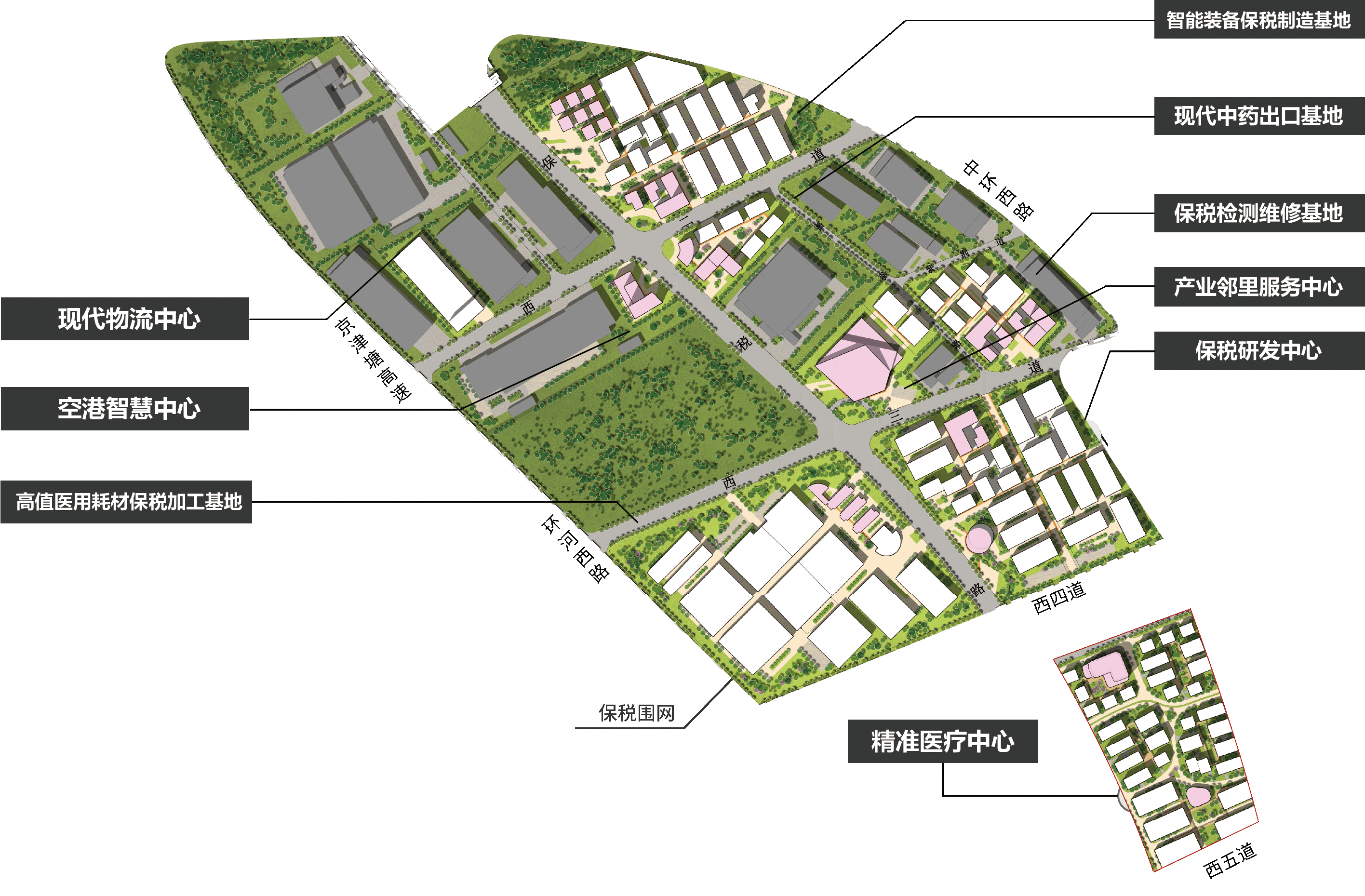 綜保區產(chǎn)業(yè)綜合提升項目批準規劃占地約65.78萬(wàn)平米,總建筑面積約72.16萬(wàn)平方米,規劃形成“四基地五中心”九大功能布局,打造包括現代中藥出口基地、高值醫用耗材保稅加工基地、智能裝備保稅制造基地、高端裝備保稅檢測維修基地、保稅研發(fā)中心、醫藥物流中心、精準醫療中心、空港智慧中心、產(chǎn)業(yè)鄰里服務(wù)中心。通過(guò)改善提升空港保稅區整體軟硬件設施,引入產(chǎn)業(yè)互聯(lián)網(wǎng)、智慧交通、建筑光伏及產(chǎn)業(yè)配套服務(wù),實(shí)現網(wǎng)內外聯(lián)動(dòng)互補和戰略性產(chǎn)業(yè)升級。包括搭建產(chǎn)業(yè)互聯(lián)網(wǎng)平臺,突破研發(fā)物理局限;利用“產(chǎn)業(yè)基金+普惠金融”模式,搭建現代化產(chǎn)融服務(wù)體系;組建產(chǎn)業(yè)基金,為合作入園企業(yè)提供優(yōu)惠政策,整合優(yōu)勢產(chǎn)業(yè)鏈上下游資源;通過(guò)動(dòng)態(tài)巴士實(shí)現機場(chǎng)與空港高效鏈接,促進(jìn)區內要素流動(dòng);利用光伏賦能建筑,打造零碳園區。